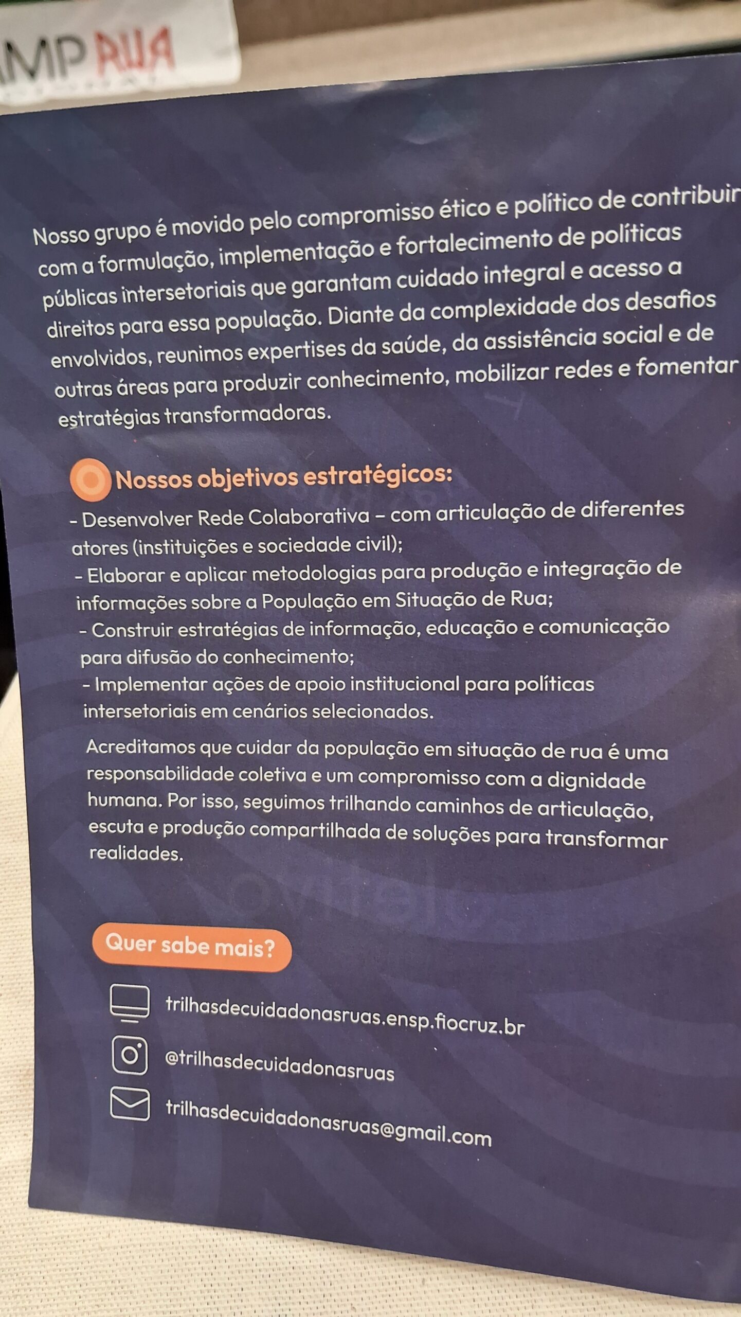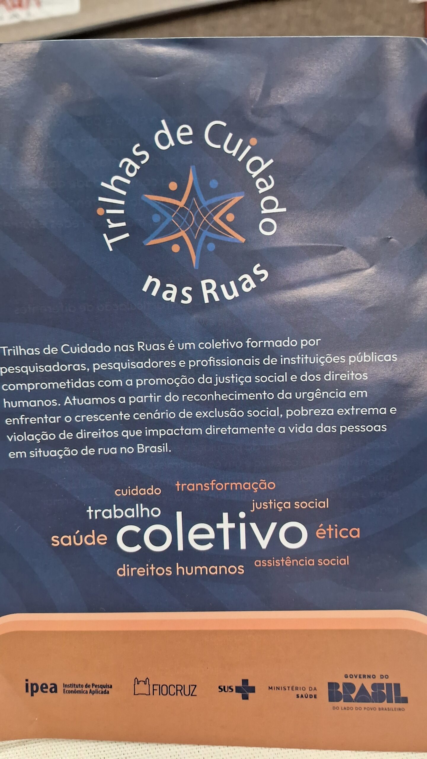 O evento foi organizado pelo coletivo Trilhas de Cuidado nas Ruas (trilhasdecuidadonasruas.ensp.fiocruz.br), com presenças institucionais como o Ipea e o Ministério dos Direitos Humanos e da Cidadania (MDHC), entre outras. Foram duas jornadas completas (aprox. 8h–18h), com pausas para refeições.