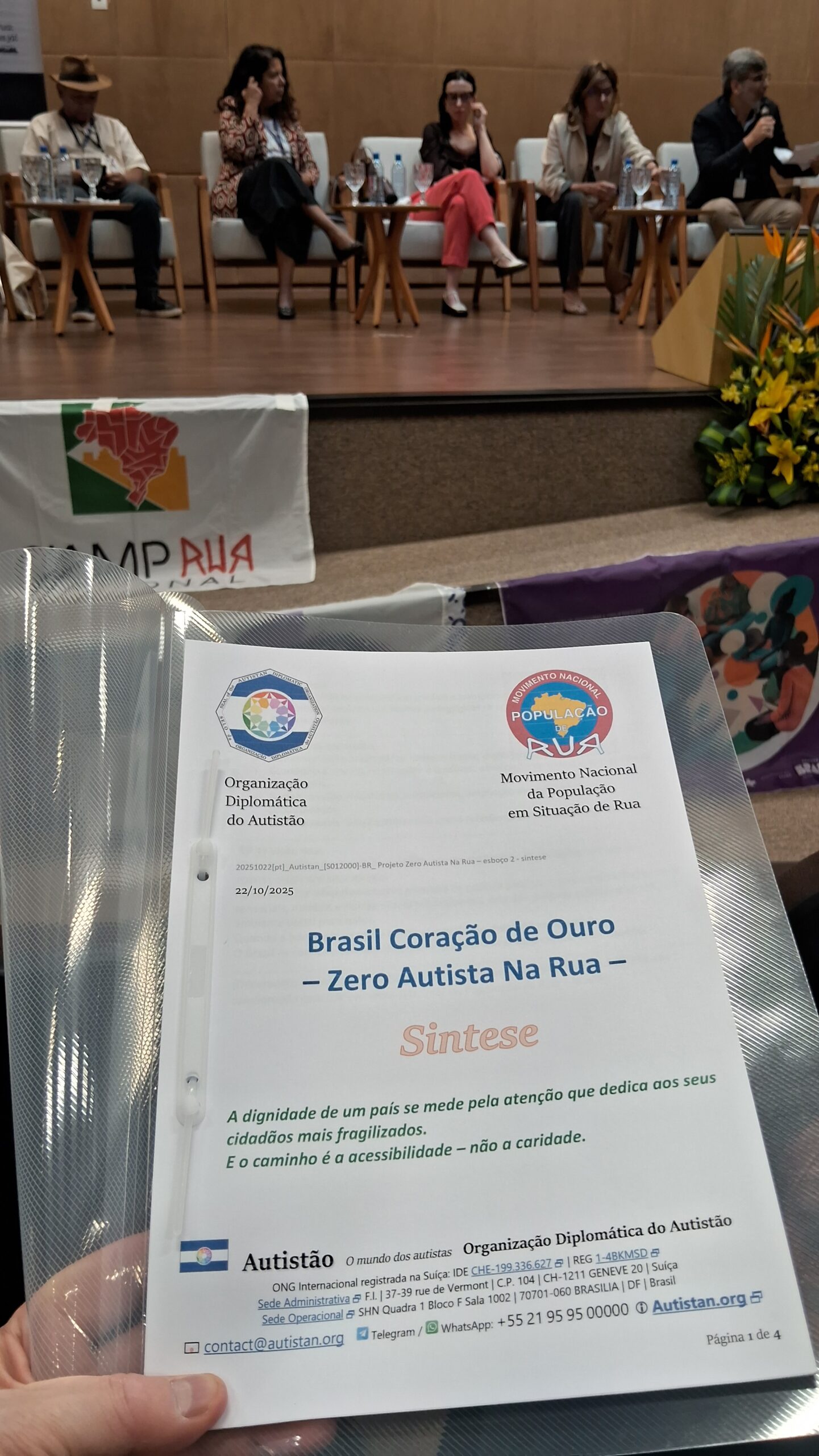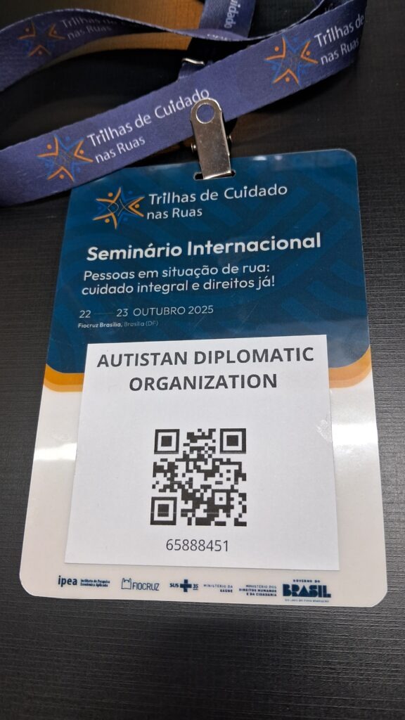 Nos dias 22 e 23 de outubro de 2025, um representante da Organização Diplomática do Autistão participou, como observador e ao lado de um representante do MNPR – Movimento Nacional da População em Situação de Rua, do Seminário Internacional “Pessoas em Situação de Rua: cuidado integral e direitos já!”, no auditório da Fiocruz Brasília (fiocruzbrasilia.fiocruz.br), sede pública com placas oficiais de inauguração presidencial, vinculada ao SUS e a órgãos federais.