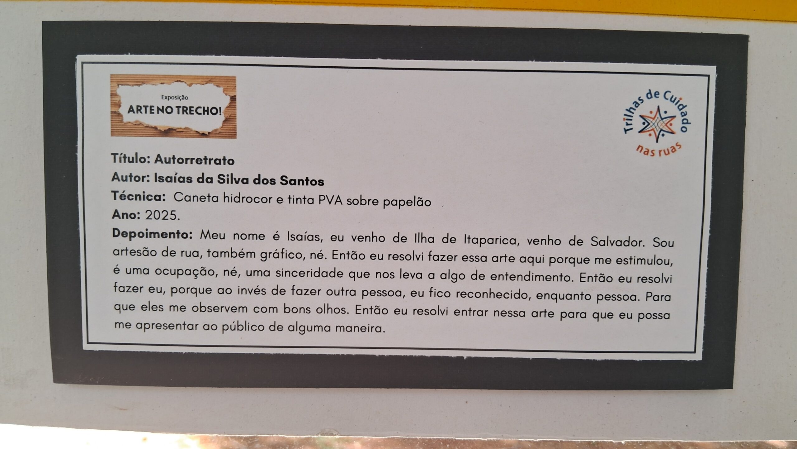 Depoimento: “Meu nome é Isaías, eu venho de Ilha de Itaparica, venho de Salvador. Sou artesão de rua, também gráfico, né. Então eu resolvi fazer essa arte aqui porque me estimulou, é uma ocupação, né, uma sinceridade que nos leva a algo de entendimento. Então eu resolvi fazer eu, porque ao invés de fazer outra pessoa, eu fico reconhecido, enquanto pessoa. Para que eles me observem com bons olhos. Então eu resolvi entrar nessa arte para que eu possa me apresentar ao público de alguma maneira.”